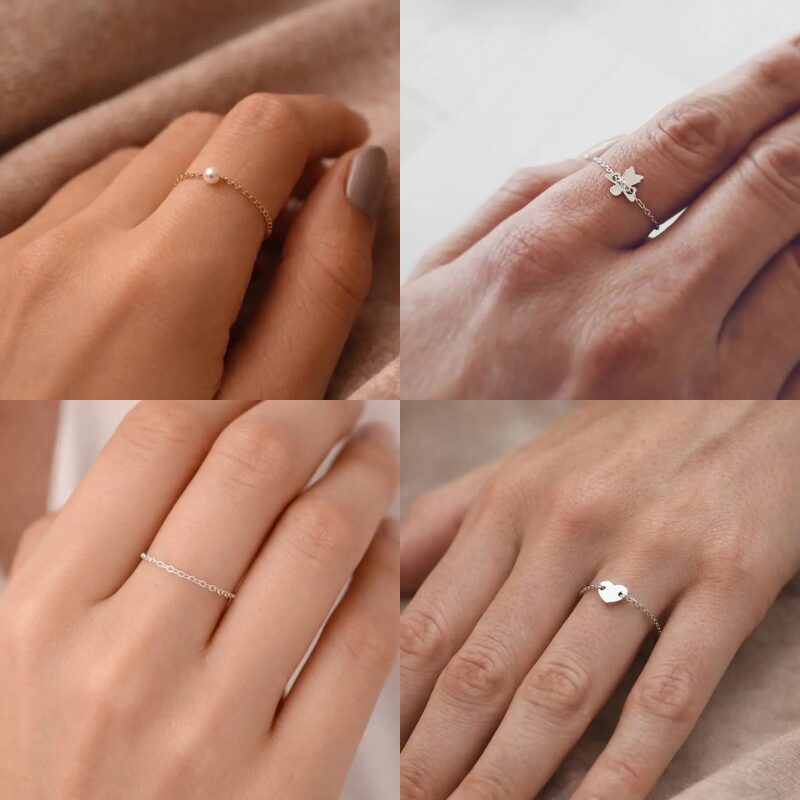 Inelele tip lanț au un farmec aparte, delicate, fluide și extrem de confortabile. Spre deosebire de modelele clasice, acestea nu sunt rigide, ci se așază natural pe deget, urmând forma acestuia.