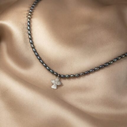Colier din Perle de Cultură Negre cu Pandantiv Îngeraș din Argint 925