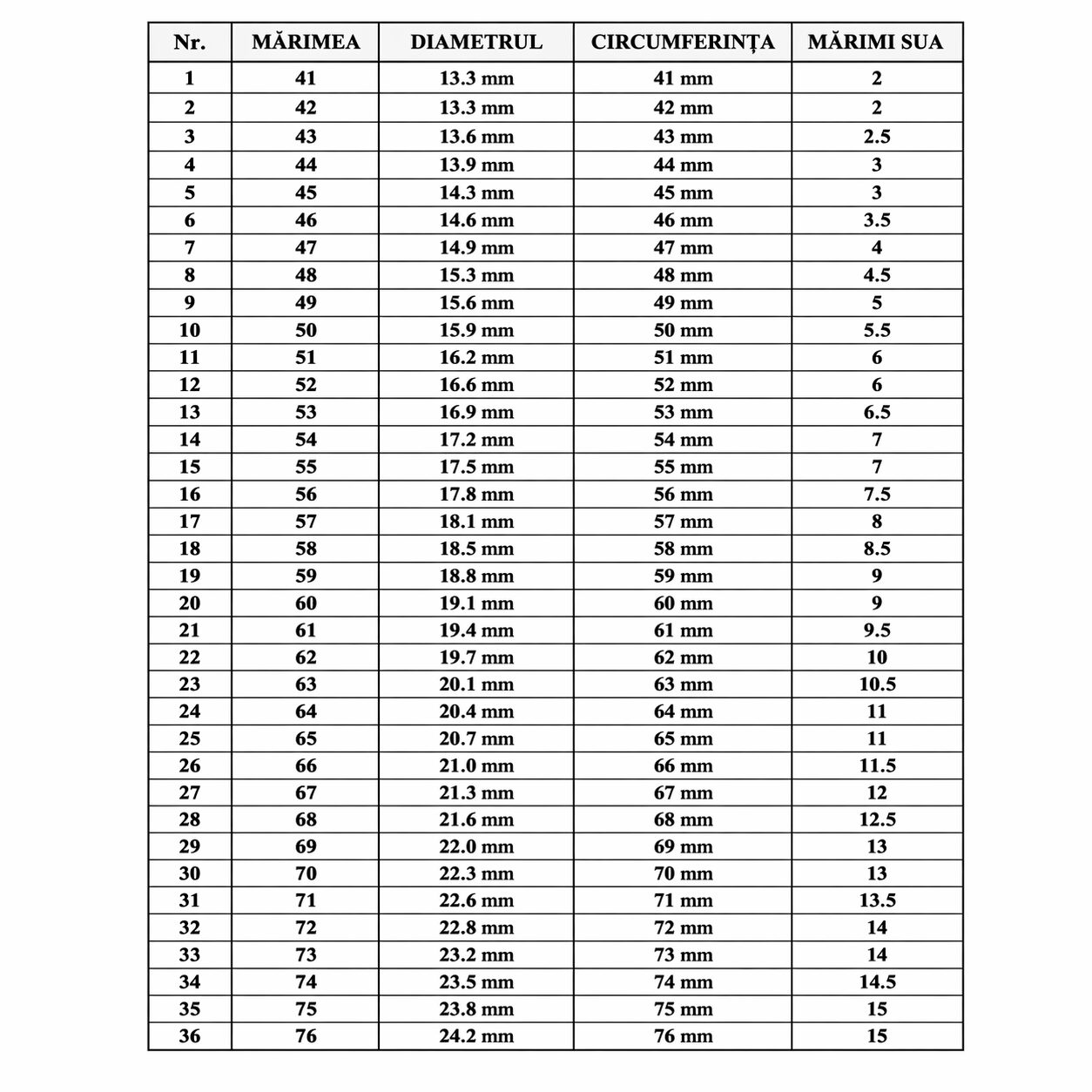 Exemplu orientativ: un diametru interior de 17,2 mm corespunde de obicei mărimii 54 în sistemul european.