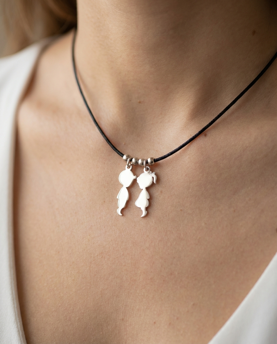 Această piesă unică poate fi purtată ca un choker sau brățară, oferind o versatilitate perfectă pentru orice moment. Este realizată dintr-un șnur de culoare roșie sau neagră, decorat cu 5 biluțe din argint 925 de 3 mm și două charmuri delicate din argint, reprezentând o fetiță (18,70 mm x 8,60 mm) și un băiețel (19,20 mm x 7,10 mm).