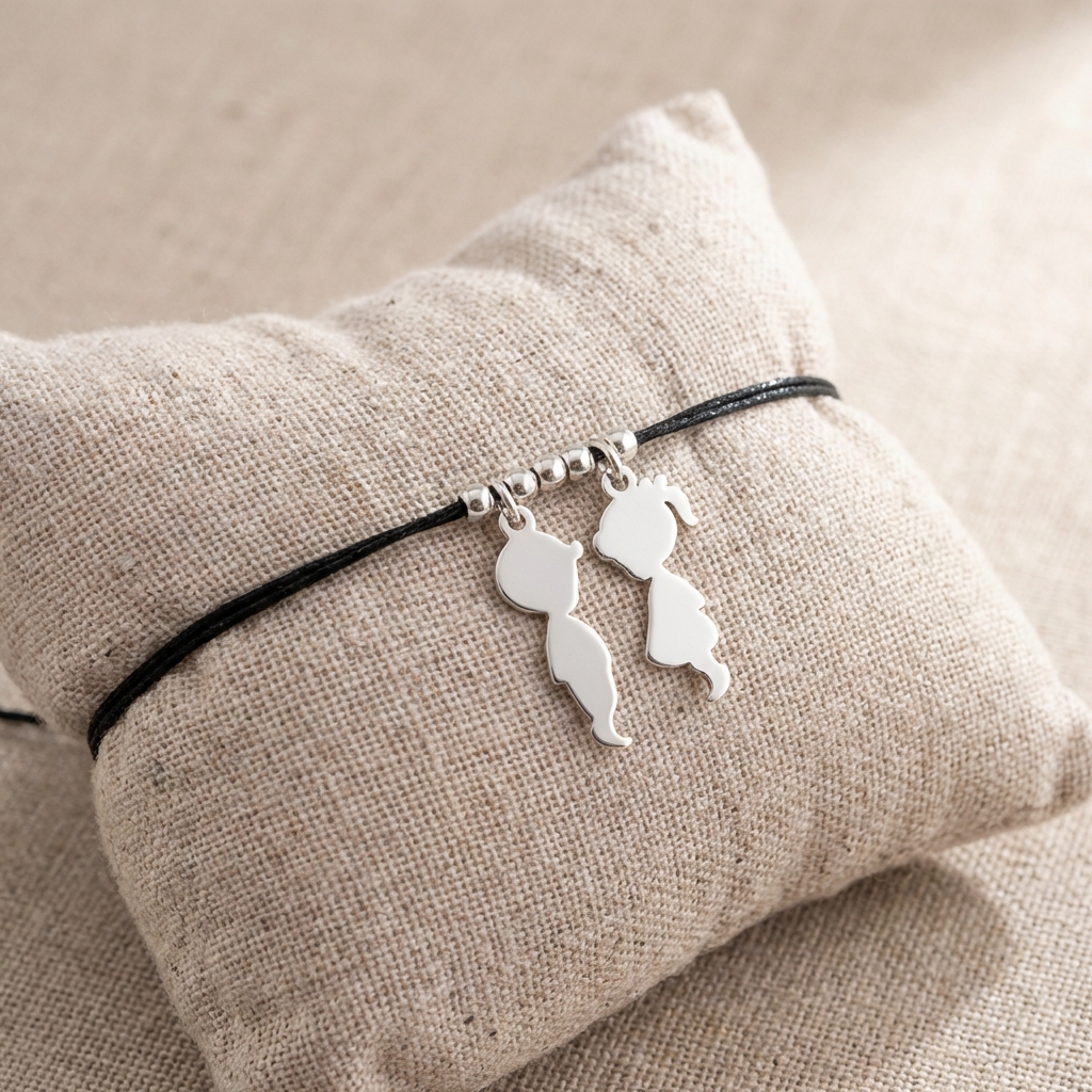 Opțiuni de personalizare: Se pot alege combinații diferite de charmuri (ex: Fetiță și Băiețel, Fetiță și Fetiță, Băiețel și Băiețel) – specificați dorințele în secțiunea „Text gravat” sau „Nota furnizată de client”.