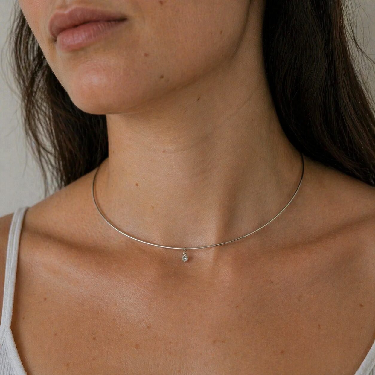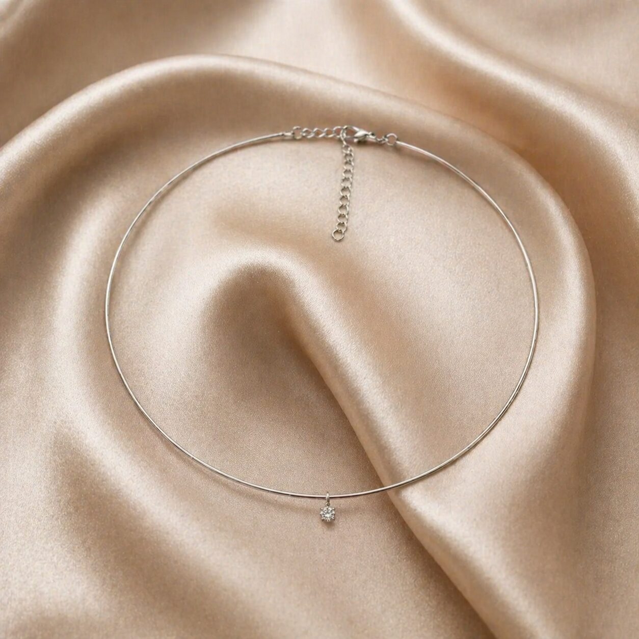 Acest choker elegant este realizat manual din sârmă plină din argint de 1,5 mm grosime și este accesorizat cu un cristal Swarovski delicat de 3 mm. Designul minimalist și rafinat îl face ideal atât pentru ținutele de zi, cât și pentru cele de seară. Fiecare piesă este lucrată cu atenție la detalii, oferind un plus de eleganță și strălucire subtilă.