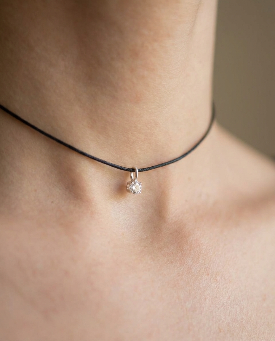 - Design: Choker cu șnur și pandantiv cu cristal Swarovski, lucrat manual