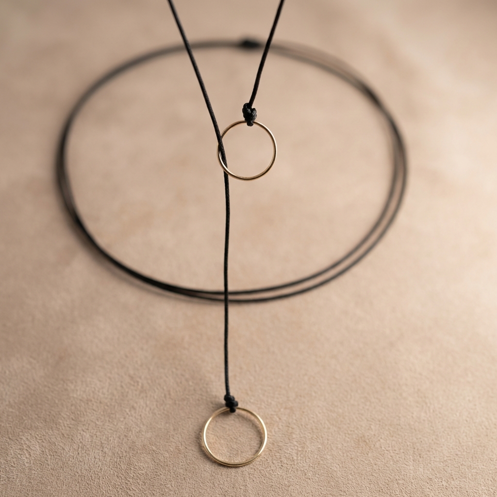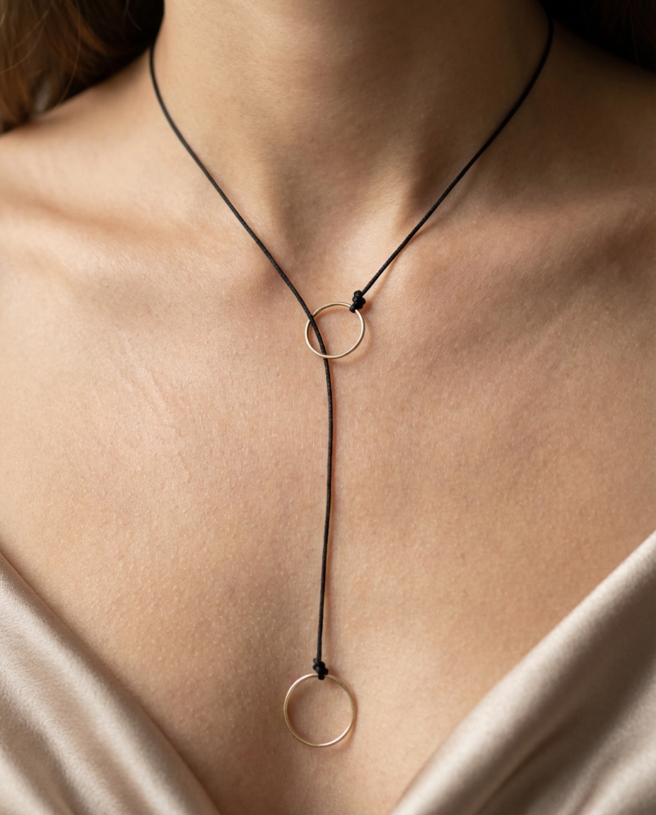 Acest choker cu șnur și două inele din argint 925 adaugă un strop de eleganță minimalistă și echilibru fiecărei ținute. Simbolistica cercurilor reflectă unitatea, eternitatea și armonia, iar lucrul manual îi conferă unicitate și rafinament aparte.