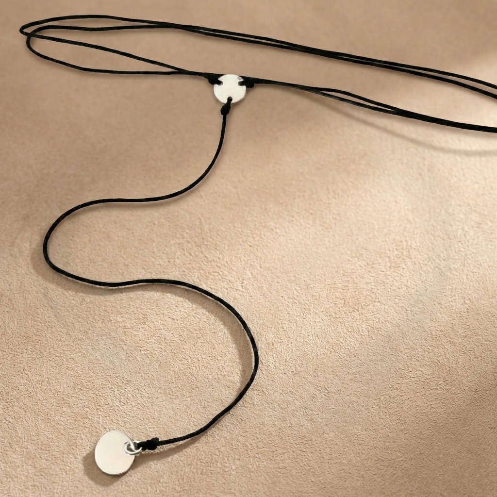 Acest choker elegant este realizat manual din șnur reglabil de mătase sintetică și este accesorizat cu doi bănuți din argint 925, de 9 mm și 10 mm. Designul minimalist și versatil îl face potrivit pentru orice ținută, de zi sau de seară. Fiecare piesă este creată cu grijă, iar bănuții pot fi personalizați cu mesajul dorit, adăugând un plus de emoție și unicitate.