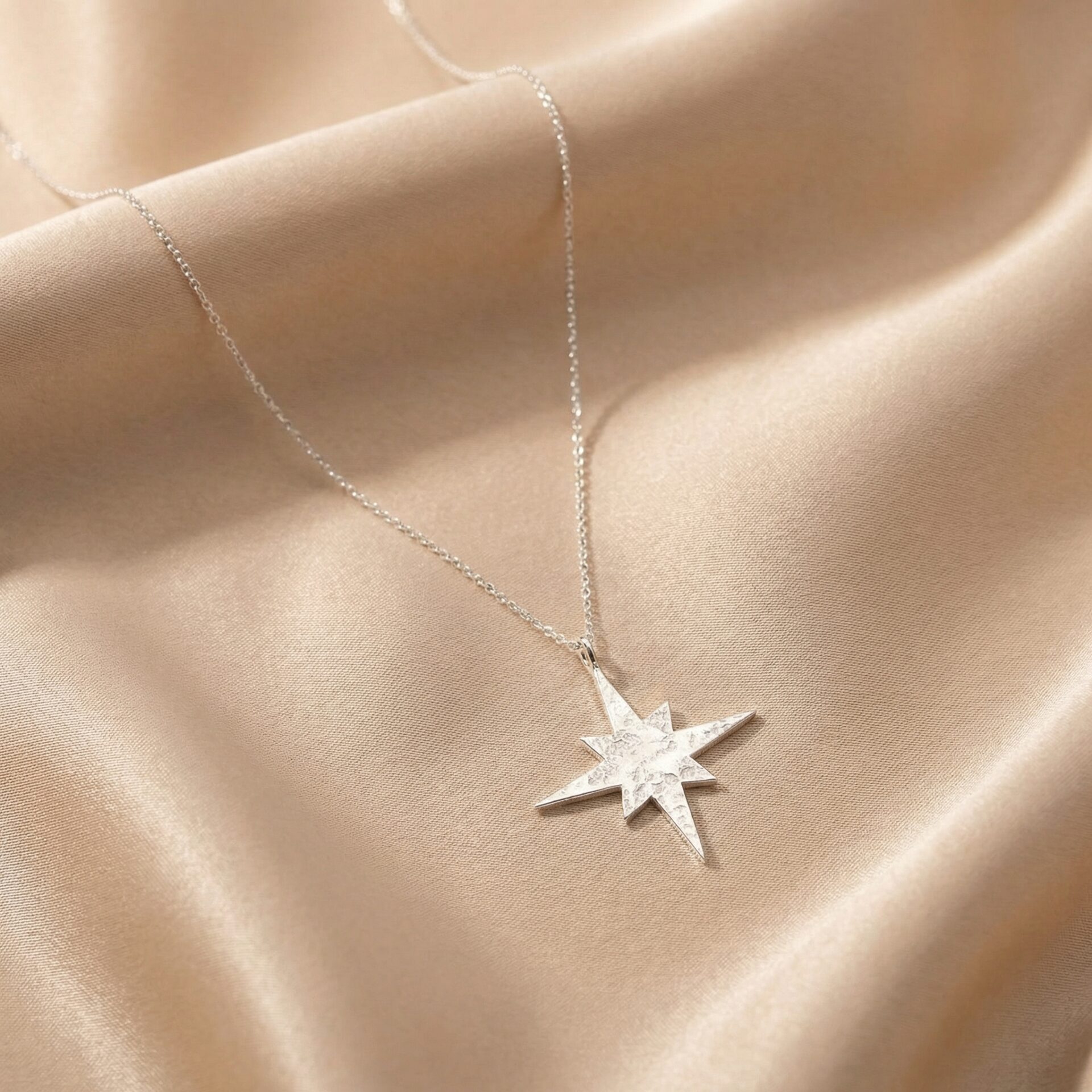 Realizat manual în atelierul Magic Charms, acest colier impresionează prin designul său delicat în formă de stea, cu textură fină ce reflectă lumina într-un mod discret și sofisticat.