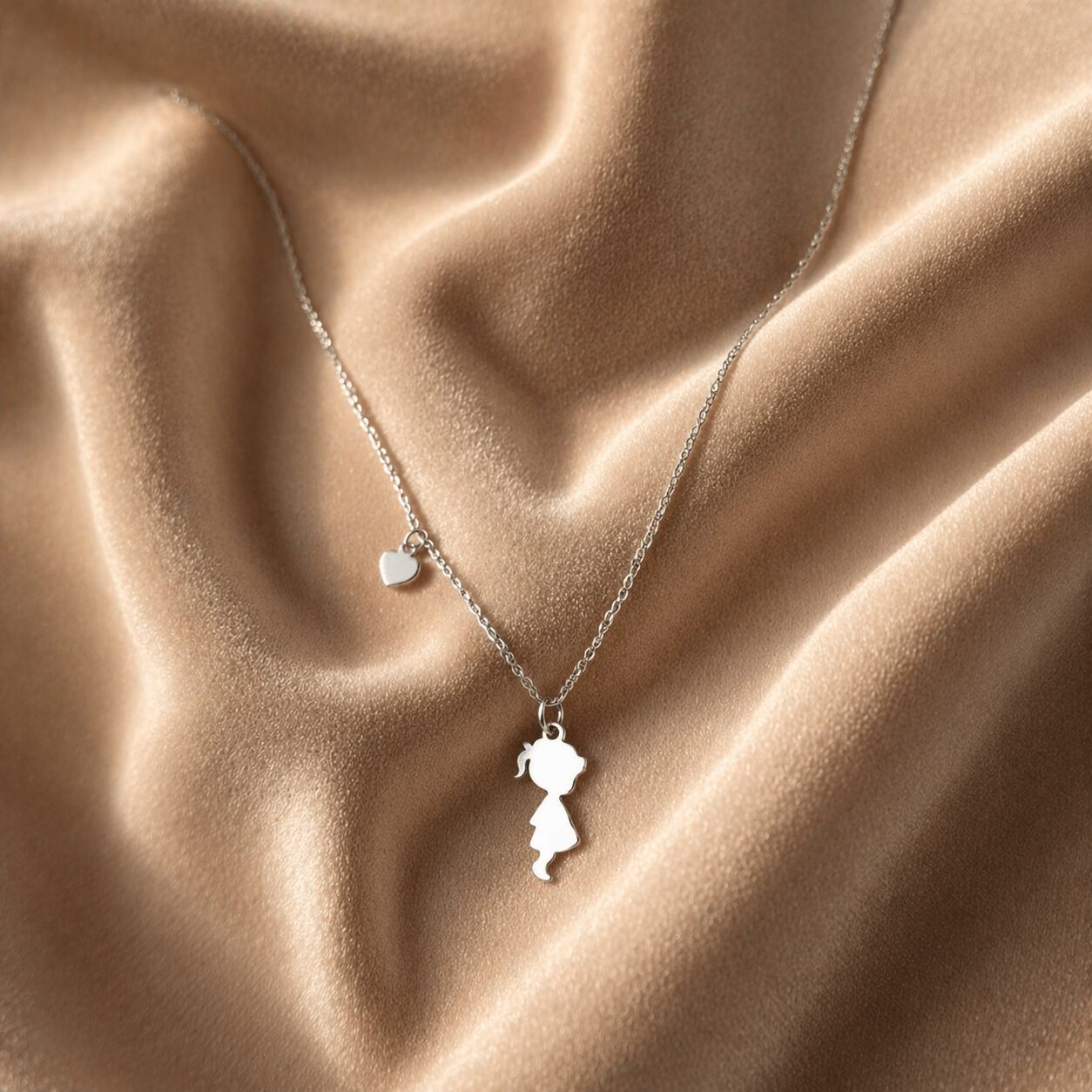 • Design: Pandantiv siluetă fetiță + disc rotund minimalist pe lanț
